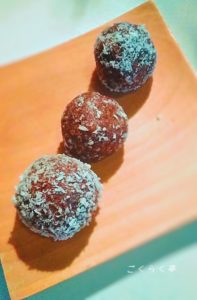 砂糖、添加物不使用、グルテンフリーをコンセプトとする、ドライフルーツやナッツなどの自然素材を原料に作られるボール状のヘルシーなスイーツで、